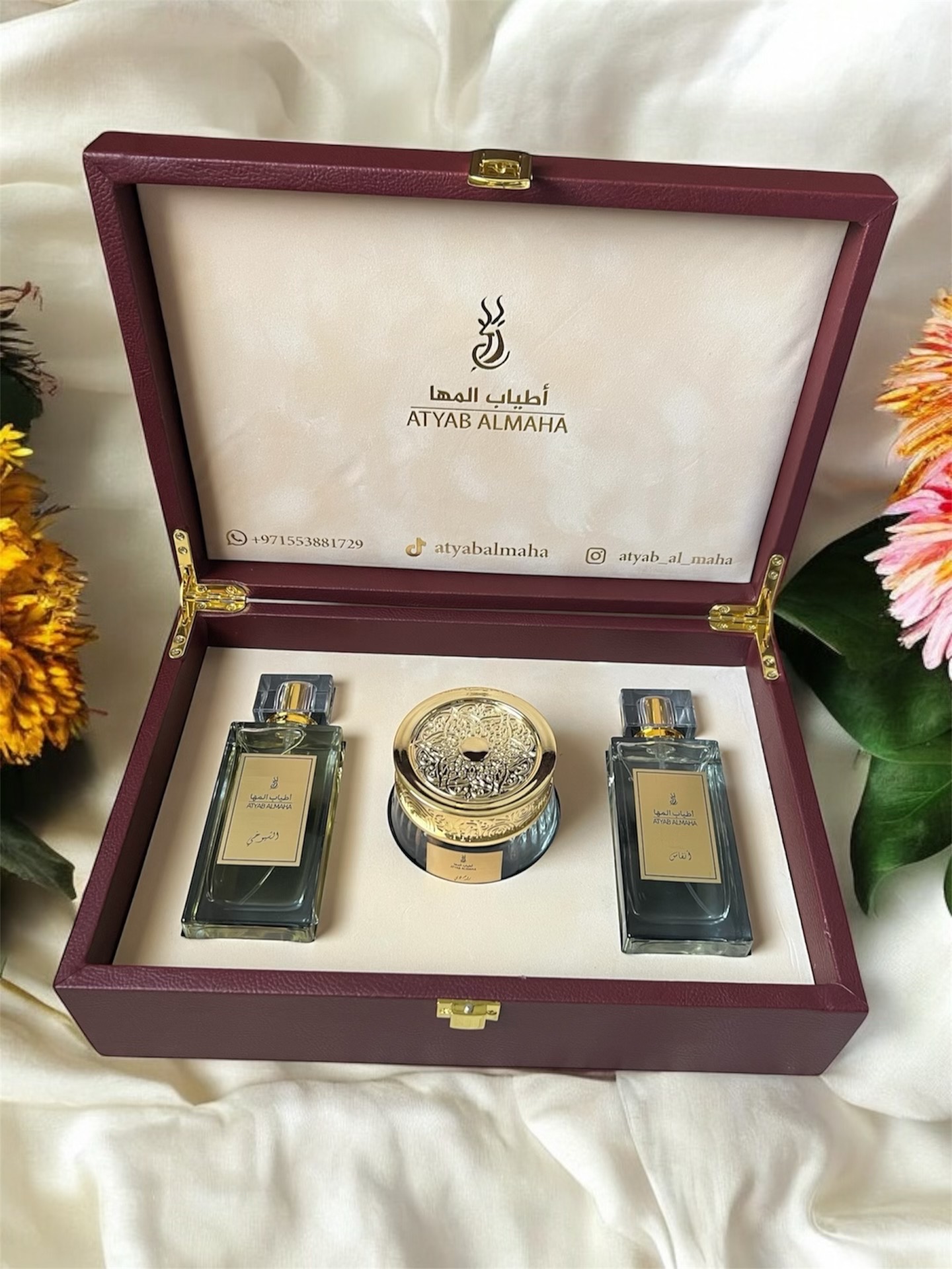مكونات المجموعة العطور والعود الفاخرة داخل علبة مميزة، تنتظرك اثنان من العطور الفريدة وعلبة من العود الفاخر التي تم انتقاؤها بعناية فائقة لتمنحك تجربة تتذكرها لعُمرٍ طويل.